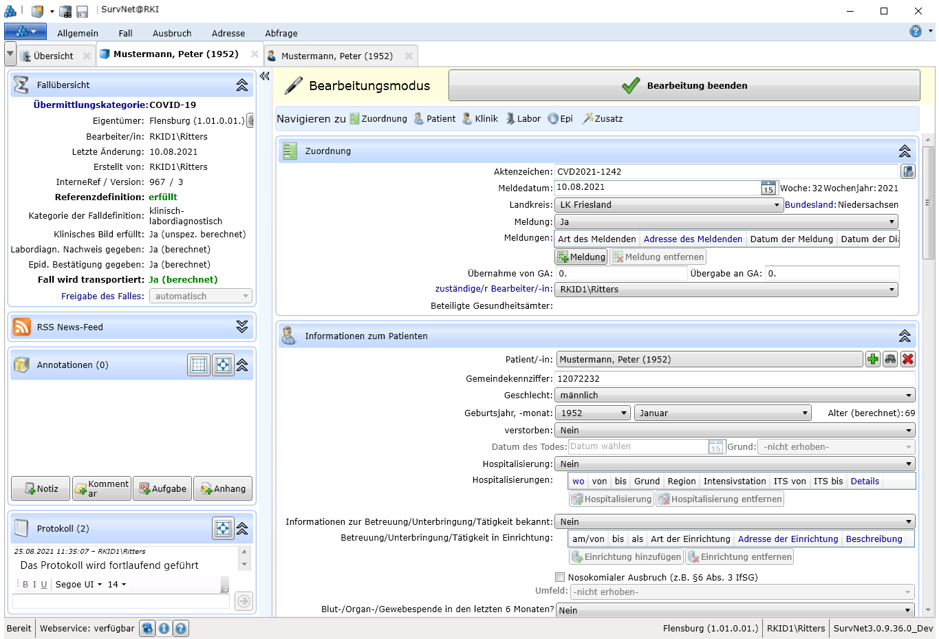 Zuordnung kann im Feld zuständiger Bearbeiter eingetragen werden, welcher Mitarbeiter sich inhaltlich mit dem Fall befasst. Wird der Fall zur Kenntnisnahme an andere Gesundheitsamt übermittelt -export, wird dies unter Beteiligte Gesundheitsämter angezeigt.