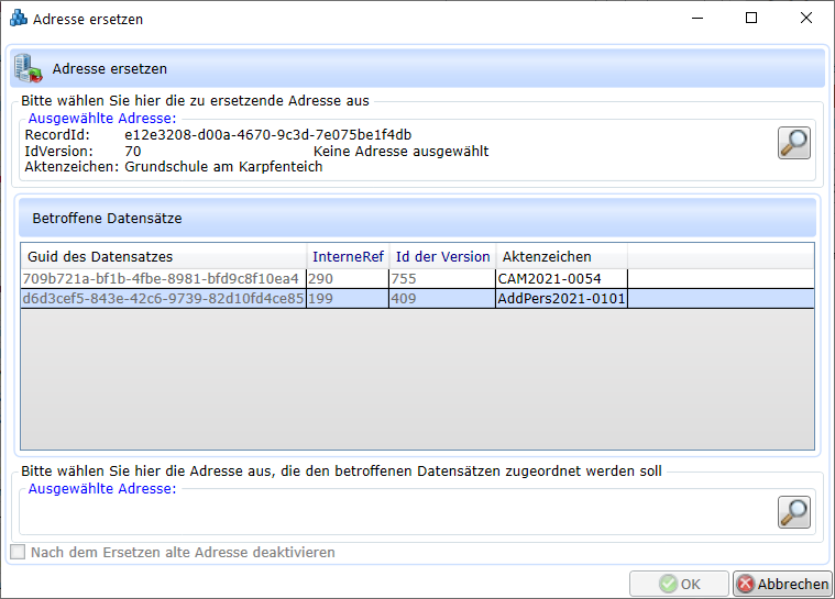 Im Abschnitt Betroffene Datensätze werden die mit der zu ersetzenden Adresse verknüpften Datensätze angezeigt, deren Verknüpfung auf eine andere Adresse übertragen werden soll. Um letztere zu spezifizieren,