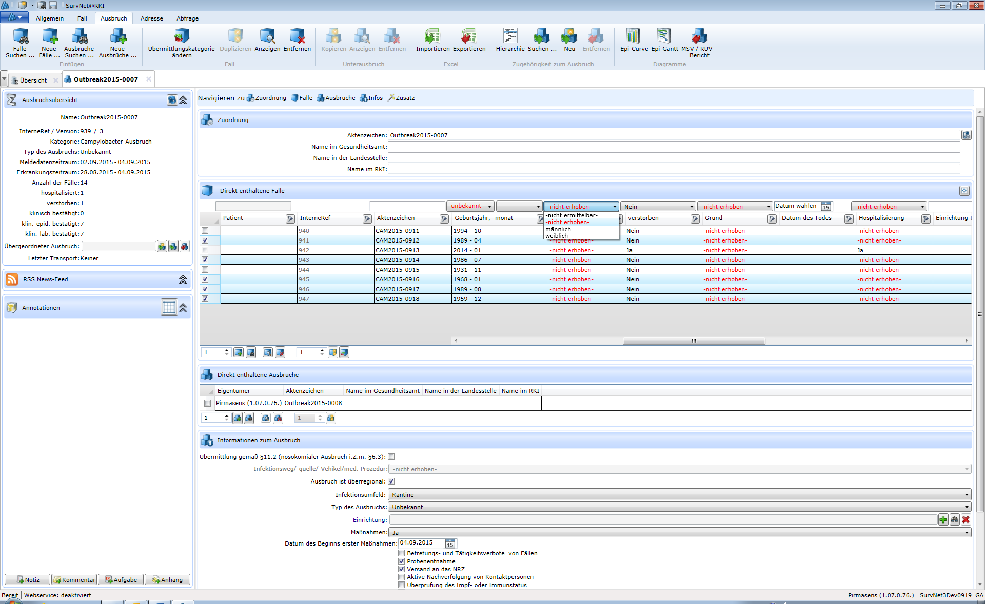 Wählen Sie anschließend in der Multifunktionsleiste wahlweise im Abschnitt Direkt enthaltene Fälle des Ausbruchs-Datenblattes >