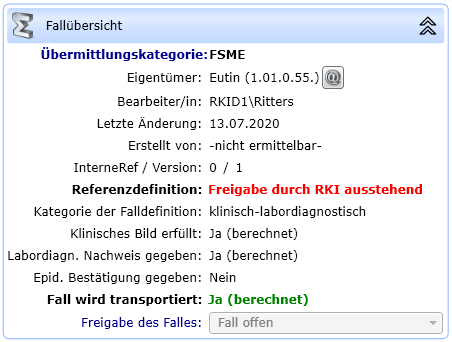 Fallübersicht werden direkt unterhalb der Anzeige der Übermittlungskategorie einige administrative Informationen aufgeführt: Eigentümer (das GA, das den Fall bearbeitet), Bearbeiter der letzten Version des Falles, Datum der letzten Änderung, Mitarbeiter, der den Fall erfasst hat sowie die interne Referenz und Version des Datensatzes (Erläuterungen dazu siehe unter 3). Außerdem wird die Bewertung eines Falles angezeigt: ob der Fall mit seinen näheren Angaben der Referenzdefinition entspricht und ob die Angaben für eine klinische, labordiagnostische und epidemiologische Bestätigung des Falles ausreichen. Hier wird neben der Zuordnung des Falles in die entsprechende Kategorie der Falldefinition auch angegeben ob er übermittlungsfähig ist (transportiert wird) und ob er (sofern er der Einzelfallkontrolle unterliegt) freigegeben wurde.