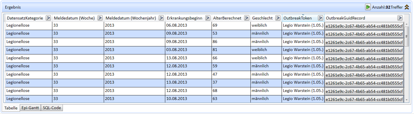 TIPP: Nach Doppelklick in eine der Ergebniszeilen öffnet sich (in einem separaten Fenster) eine Liste der zugehörigen Datensätze (Fälle, Ausbrüche, Adressen).