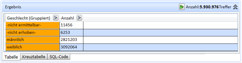 Beispiel: Eine Gruppierung von Fällen nach dem Feld Geschlecht ergibt eine Tabelle mit je einer Zeile für jede der Ausprägungen des Feldes, also männlich, weiblich, nicht erhoben und <nicht ermittelbar> für die im Datenbestand mindestens ein Datensatz vorhanden ist. Als Ergebnis wird zu jeder dieser Ausprägungen die Anzahl der Fälle angezeigt, die alle Bedingungen der Abfrage erfüllen: