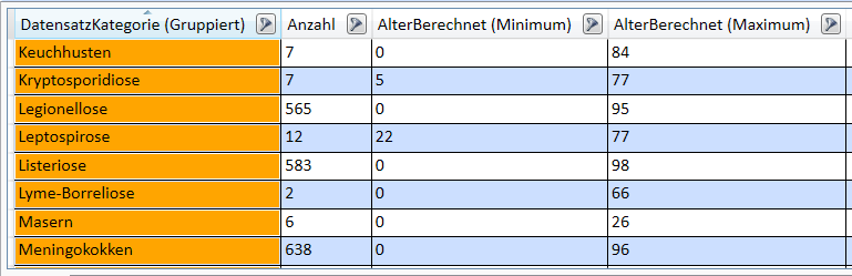 Nullwerte anzeigen ausgewählt sein. Werden z.B. Fälle nach Altersschichtung gruppiert, weist die Ergebnistabelle damit auch Zeilen für Altersgruppen auf, in denen es keine Fälle gibt. Als Ergebnis wird dann ‚0’ ausgewiesen.