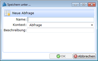 TIPP: Bevor Sie eine neue Abfrage speichern, tragen Sie bitte einen Titel, einen Kontext und eine Beschreibung ein. Der Kontext dient der inhaltlichen Gruppierung der gespeicherten Abfragen. Beim Öffnen von Abfragen lässt sich die Suche über eine Auswahlliste nach Kontext eingrenzen und im Titel und der Beschreibung kann nach einem Begriff (oder Teil davon) gesucht werden.