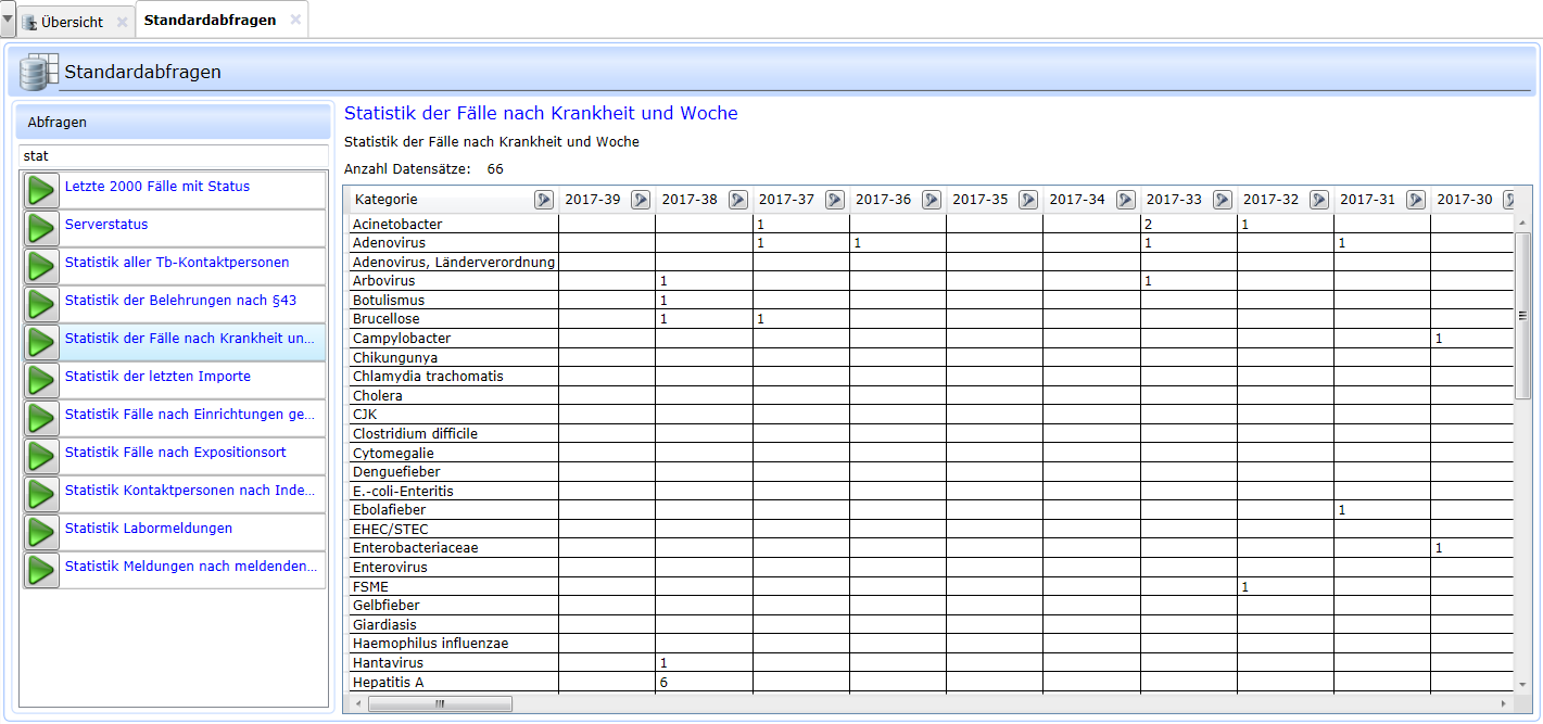 Statistik der Fälle nach Krankheit und Woche: stellt für das laufende Jahr die Anzahl vorhandener Fall-Datensätze nach Krankheit und Meldewoche dar. Dabei spielt es keine Rolle, ob die Referenzdefinition erfüllt ist oder nicht.