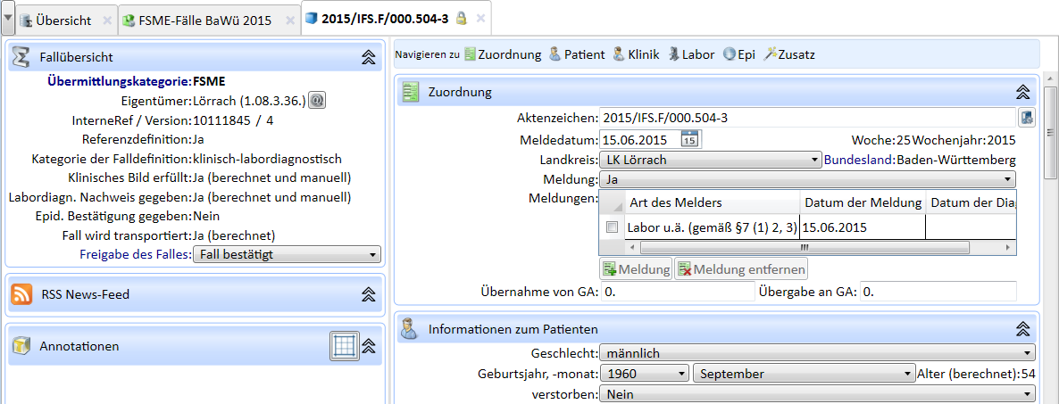 Die Datenblätter zu den gelisteten Datensätzen können Sie sich anzeigen lassen, sofern die Fälle in Ihrer lokalen Datenbank vorhanden sind.