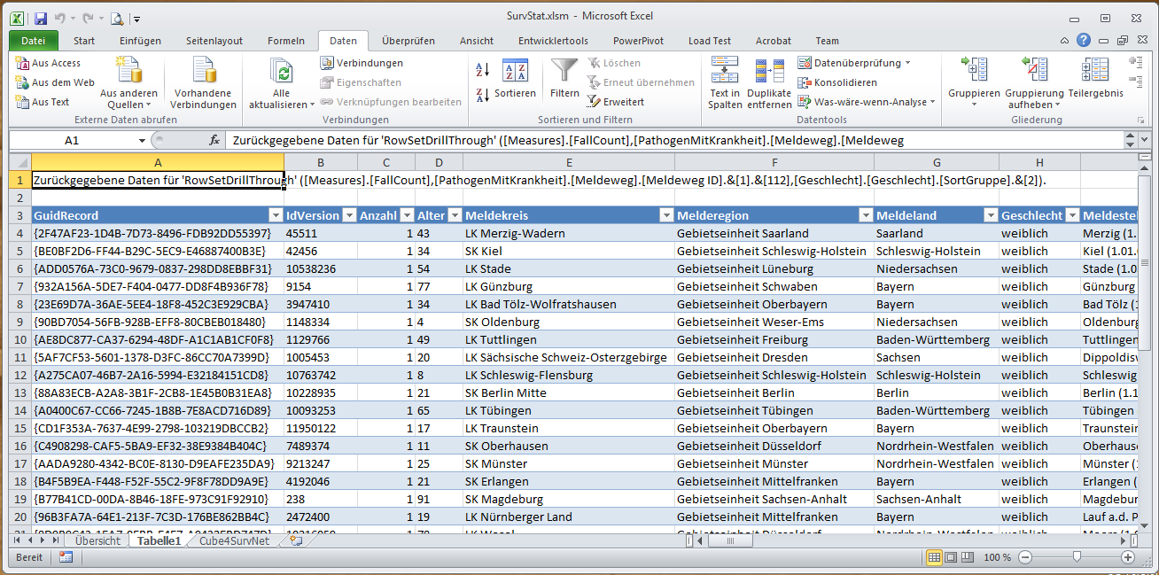 -survstat haben Sie bereits erfahren, wie Sie mit SurvNet@RKI unter Einsatz sog. SurvStat-Abfragen auf den tagesaktuellen RKI-Datenbestand zugreifen können. Mit einer OLAP-Abfrage können Sie vergleichbare Abfragen, unabhängig von SurvNet@RKI, in einer Excel-Datei definieren und ausführen, sofern Ihre Übermittlungsstelle am Webservice angemeldet ist -webservice und Sie einen Internet-Zugang haben.