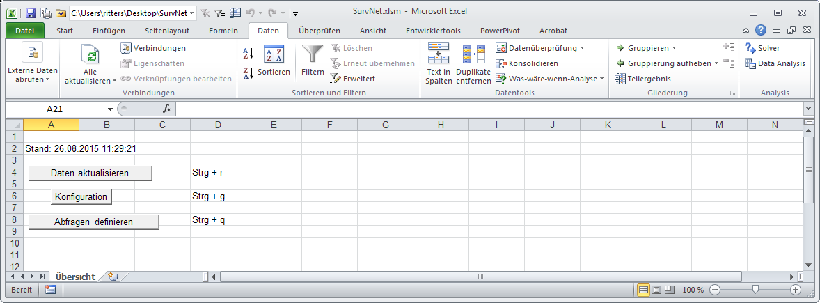 SQL im Register Abfrage, Gruppe Excel-Abfragen der Multifunktionsleiste.Es wird eine Excel-Datei (SurvNet.xlsm) erzeugt und geöffnet (Abb.4.7.2a).