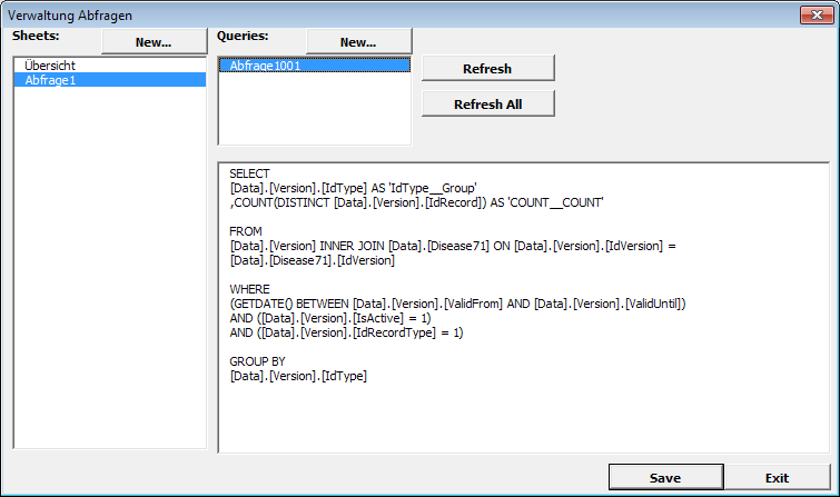 Die Schaltfläche Abfrage definieren im Blatt Übersicht öffnet ein Fenster, in dem in bestehende oder neue Blätter Abfragen eingebaut werden können(Abb.4.7.2b). Nachdem der SQL-Code eingegeben und gespeichert ist, aktualisiert die Schaltfläche Refresh bzw. Refresh All das Ergebnis der einzelnen bzw. aller Abfragen im ausgewählten Excel-Blatt.