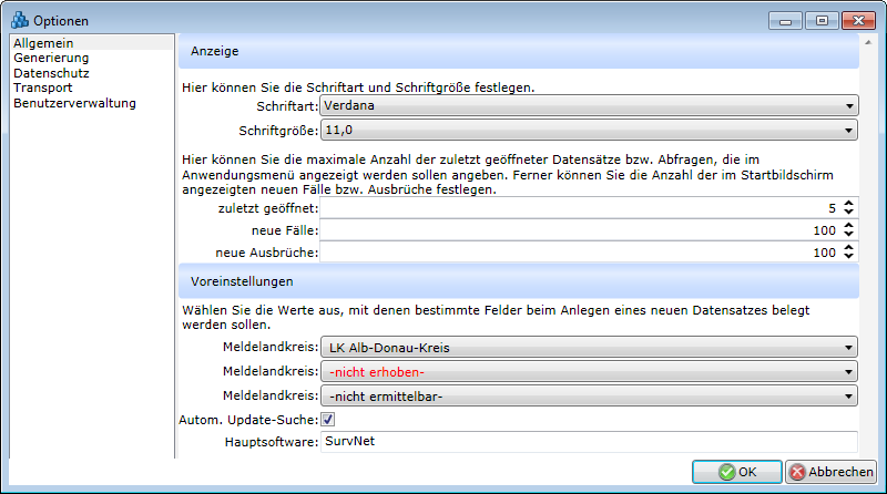 ) im Register Allgemein der Multifunktionsleiste. Wird SurvNet@RKI als Modul innerhalb einer anderen Software verwendet, so sollte im Feld Hauptsoftware der Name der Software (z.B. mikropro) eingetragen werden.