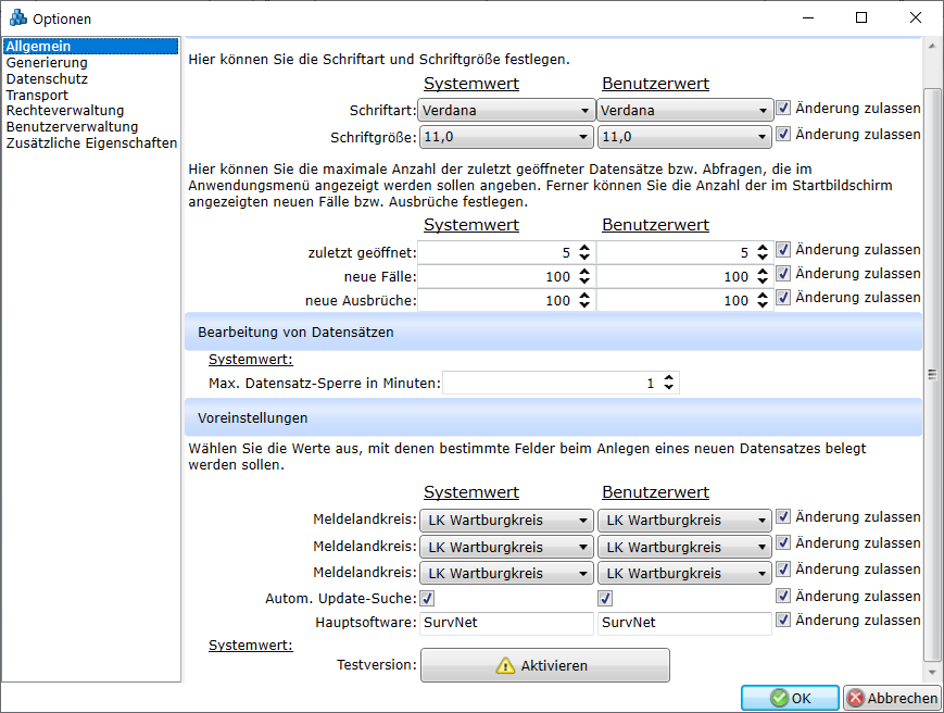 Die Anzeige der SurvNet-Optionen unterscheidet sich je nach Profil des Nutzers: Nur Adminstratoren haben Zugriff auf die Rechte- und die Benutzerverwaltung. Darüber hinaus legen Vorgaben durch den Administrator fest, welche Einträge in den für ‚normale’ Nutzer zugänglichen SurvNet-Optionen verändert werden dürfen. Zu diesem Zweck kann in der Adminstrator-Ansicht der SurvNet-Optionen für jedes Feld eine Änderung zugelassen bzw. explizit verweigert werden.