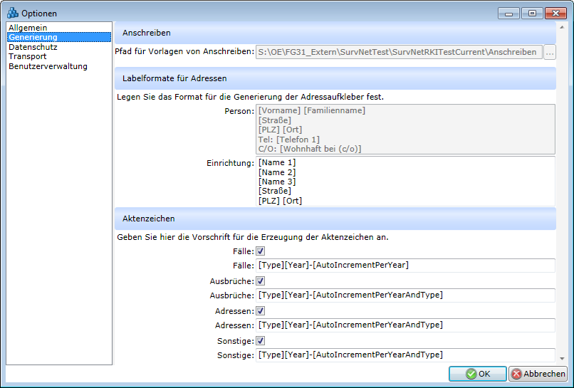 Im Abschnitt Aktenzeichen können Vorgaben für das Format automatisch generierter Aktenzeichen -datenerfassung von Fällen, Ausbrüchen und Adressen gemacht werden. Dazu steht eine Reihe von Feldern und Systemvariablen zur Verfügung, die durch eckige Klammern gekennzeichnet sind. Darüber hinaus kann aber auch jeder beliebige Text als Bestandteil eingebaut werden.