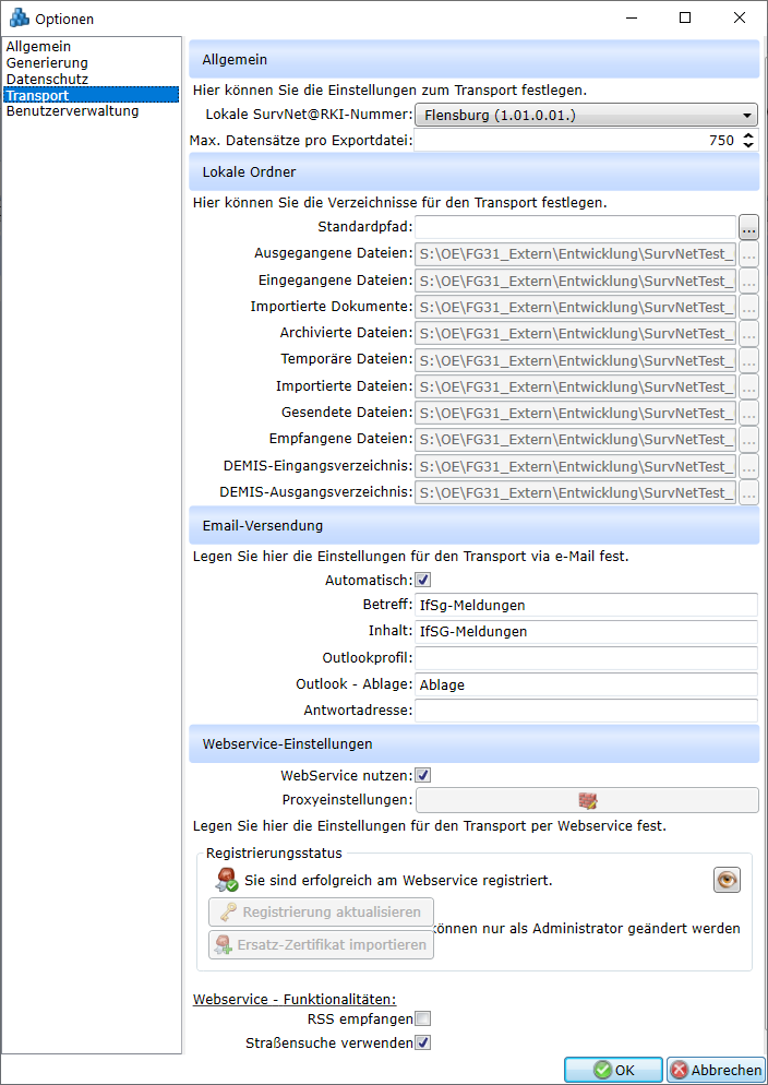 Im Abschnitt Webservice-Einstellungen kann festgelegt werden, ob zur Übermittlung, an Stelle des Versands per E-Mail, ein vom RKI angebotener Webservice genutzt werden soll. Die Transportfunktion via Webservice setzt eine einmalige Registrierung voraus (Näheres -webservice). Bei der Konfiguration des Webservice-Zugriffs kann zusätzlich angegeben werden, welche Webservice-Funktionen genutzt werden sollen. Bei langsamer Internetverbindung kann das Nicht-Nutzen von RSS und Straßensuche erforderlich sein.