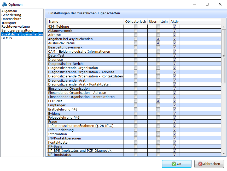 Zusätzliche Eigenschaften -eigenschaften sind Bausteine/Elemente, mit denen sich ein Datensatz um vordefinierte Felder oder Feldgruppen erweitern lässt. Damit können Informationen standardisiert erfasst werden, für die es im ‚Normalformat’ eines Datensatzes keine passenden Felder gibt. Für jedes dieser Elemente kann in den erweiterten SurvNet-Optionen eingestellt werden, ob es zur Auswahl angeboten werden soll ( aktiv), ob es standardmäßig beim Anlegen eines Datensatzes eingebaut wird ( obligatorisch) und ob ein es standardmäßig transportiert ( übermitteln) werden soll (siehe Abb.6.2.7).