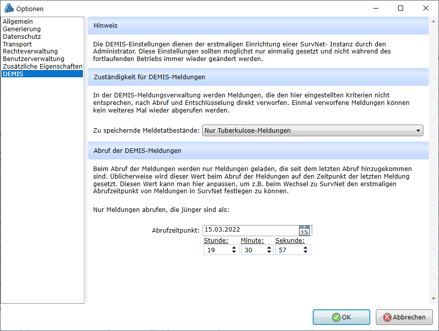 81.6 SurvNet-Optionen – DEMIS (Administratoransicht)