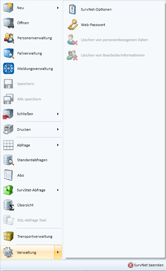 Verwaltung erreichen Sie: - SurvNet-Optionen (Einstellungen) - Datenschutz-relevante Befehle - Standardabfragen - SurvStat-Abfragen (bundesweite Daten)