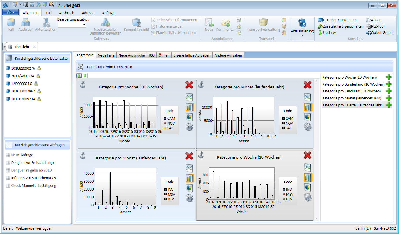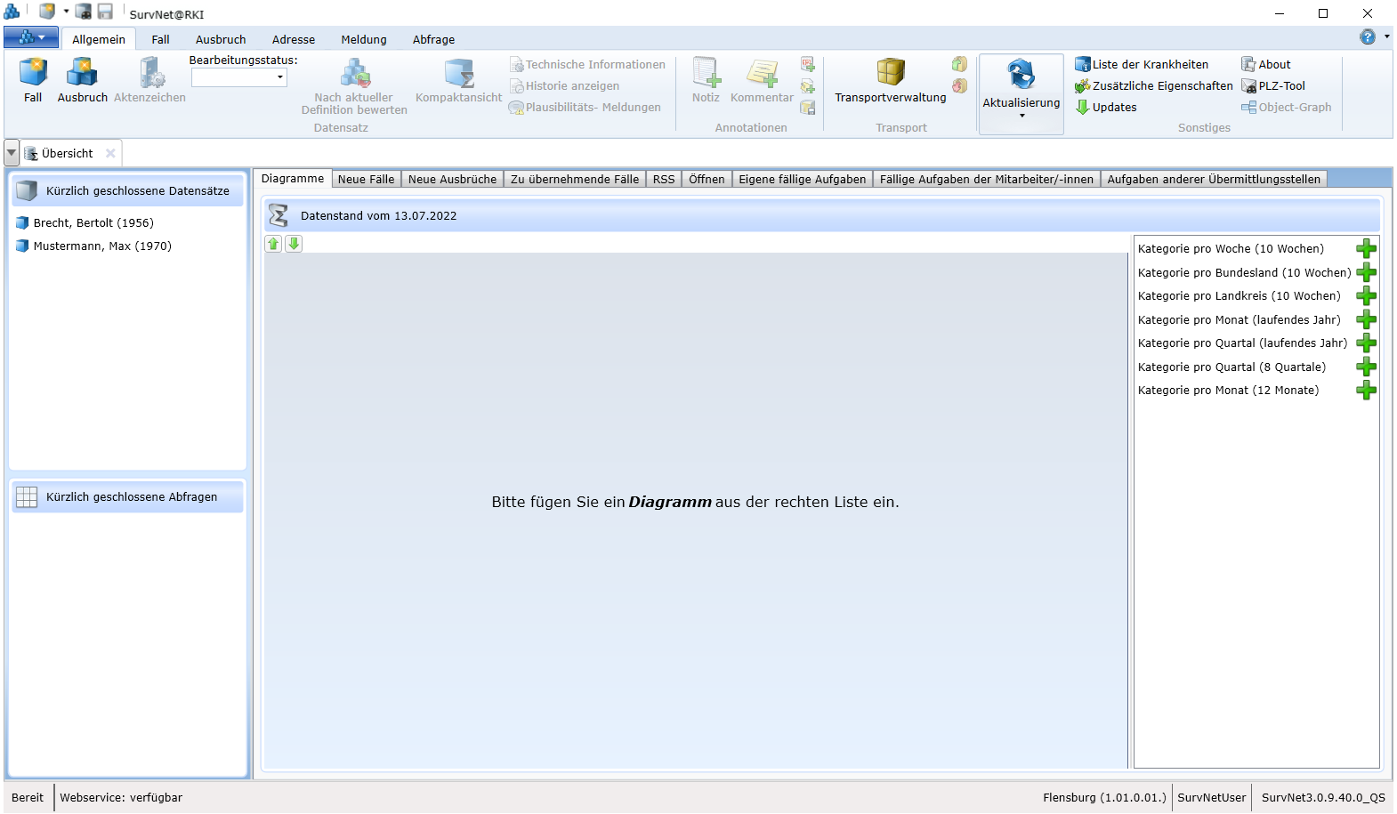 Wichtigste Register: - Diagramme: Fallzahlen der letzten 10 Wochen - Neue Fälle: Zuletzt angelegte oder importierte Fälle - Öffnen (Suche): Datensätze suchen und öffnen - Eigene fällige Aufgaben: Was heute zu erledigen ist