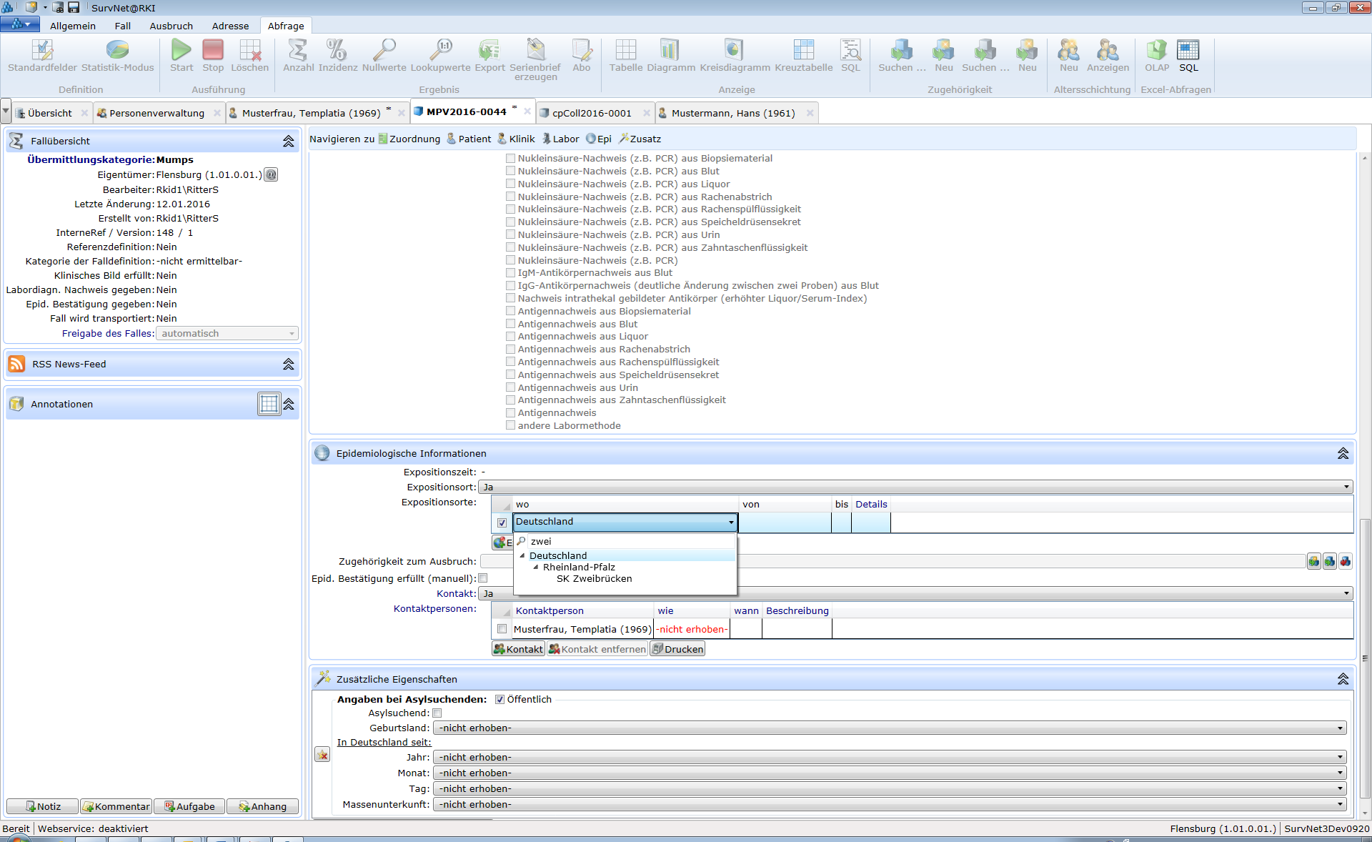 TIPP Bei einigen Auswahllisten (z.B. Erregerangaben bestimmter Krankheiten oder Expositionsort für Fälle; Ortsangaben bei Adressen) kann ein Suchtext eingegeben werden, anhand dessen die Liste zur Auswahl gefiltert wird.