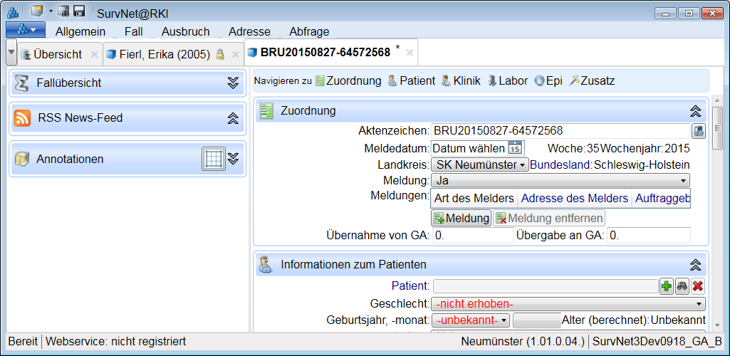 Aus den Angaben für das Meldedatum von Fällen werden die Meldewoche und das Wochenjahr berechnet und im Formular hinter dem Feld Meldedatum angezeigt.