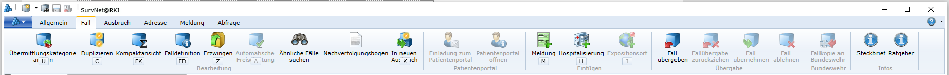 Je nach Art des geöffneten Datensatzes wechselt SurvNet@RKI automatisch in das jeweilige Register der Multifunktionsleiste, das die Befehle zur Bearbeitung des Datensatztyps enthält.