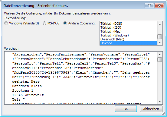 Sobald Sie dem Vorgang mit OK zustimmen, wird der Inhalt der Datenquelle für das Dokument lesbar gemacht. Danach erscheint Ihre Vorlage mit den eingefügten Seriendruckfeldern in doppelten Klammern («…») im Adressblock und in der Anrede.