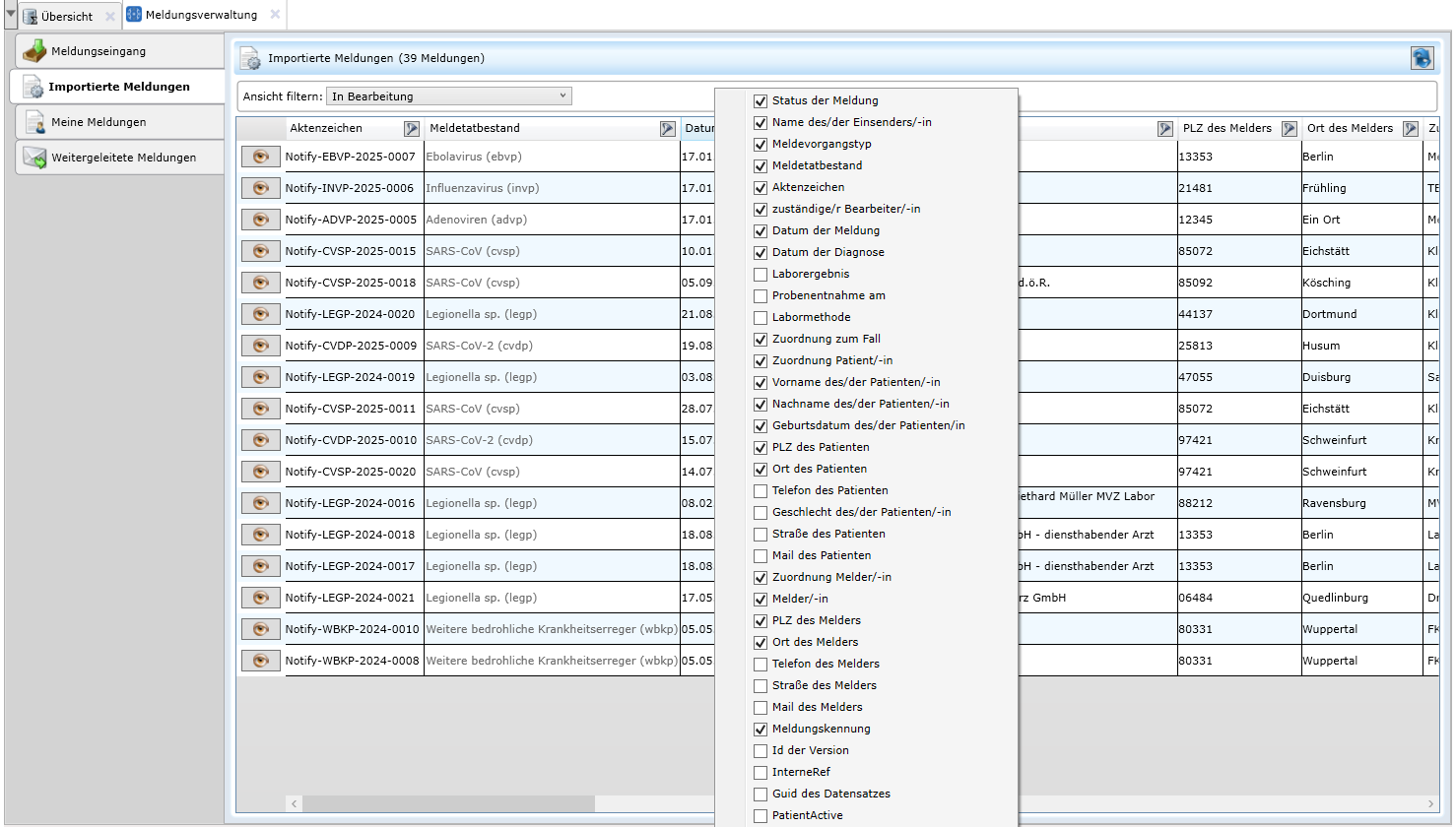 Nach dem Import einer elektronischen Meldung (xml) liegt diese als Meldungs-Datensatz (mit Aktenzeichen „Notify-..) in der lokalen Datenbank vor. Mit dem Import durch einen berechtigten Nutzer im Gesundheitsamt wird dieser zunächst als ‚zuständiger Bearbeiter’ für die Meldung festgehalten. Alle Meldungen, für die ein Nutzer als zuständig eingetragen ist, werden in dessen Liste ‚Meine Meldungen’ angezeigt.