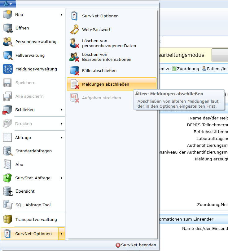 INFO Im Register Allgemein der SurvNet-Optionen kann durch Ihren SurvNet-Admin festgelegt werden, nach wie vielen Wochen seit dem Import, Meldungen auf diese Weise gemeinsam abgeschlossen werden. Nur wenn hier ein Eintrag \(\geq\) 1 eingetragen ist, wird die Schaltfläche angezeigt aktiv.