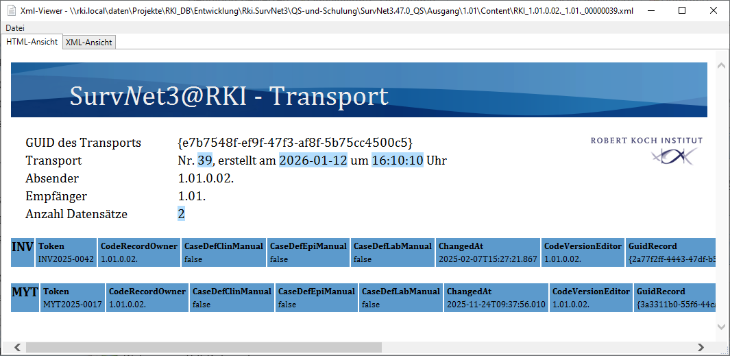 Ausgewählte Dateien anzeigen im Transporteingang und -ausgang können durch Markierung ausgewählte Transportdateien geöffnet und im Detail betrachtet werden. Zur Anzeige von Dateien im XML-Format öffnet sich ein Fenster des Standard-Browsers TXT-Dateien werden in einem Editor (z.B. Notepad) dargestellt.