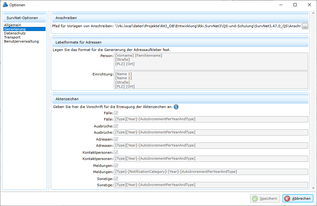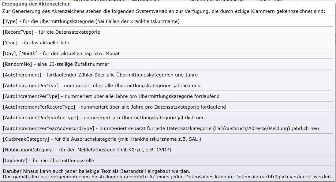Im Abschnitt Aktenzeichen können Vorgaben für das Format automatisch generierter Aktenzeichen von Fällen, Ausbrüchen und Adressen gemacht werden. Dazu steht eine Reihe von Feldern und Systemvariablen zur Verfügung, die durch eckige Klammern gekennzeichnet sind. Darüber hinaus kann aber auch jeder beliebige Text als Bestandteil eingebaut werden.