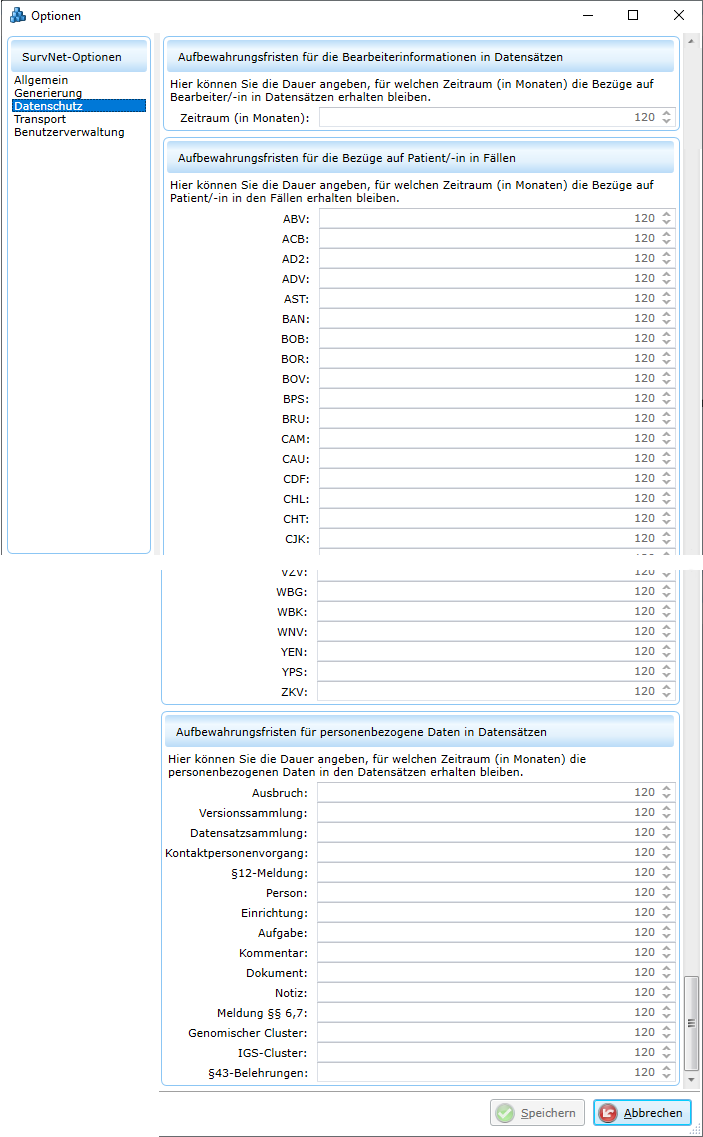 Zur Bearbeitung von Fällen im Gesundheitsamt sind Angaben zur Person des Patienten/der Patientin unerlässlich. Die Verknüpfung zwischen Fall- und Personendaten in SurvNet@RKI sollte gelöscht werden, sobald ein Fall abgeschlossen ist. Zur automatisierten Löschung der Patientenbezüge kann im gleichnamigen Register der SurvNet-Optionen für jede Übermittlungskategorie ein Zeitraum beginnend mit dem Meldedatum definiert werden, über den die Patientenzuordnung in einem Fall erhalten bleibt. Wird unter dem Punkt