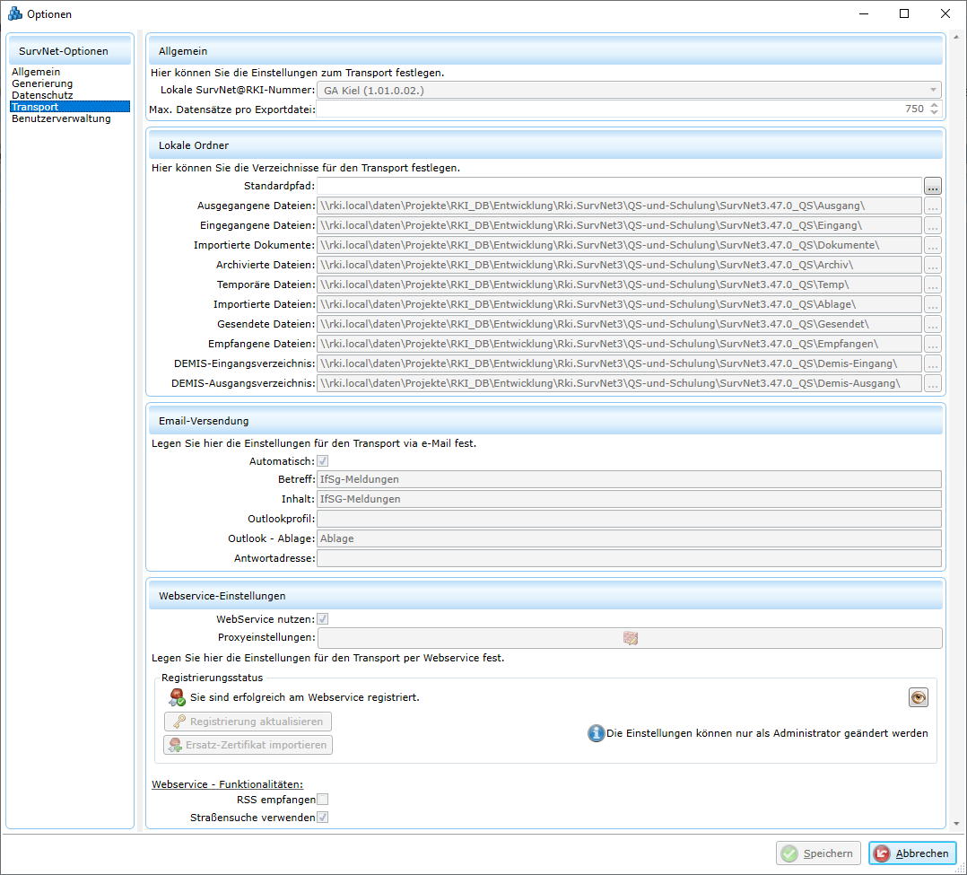 Im Abschnitt Webservice-Einstellungen ist festgelegt, dass zur Übermittlung der vom RKI angebotener Webservice genutzt wird Die Transportfunktion via Webservice setzt eine einmalige Registrierung voraus (Näheres unter 6.3). Bei der Konfiguration des Webservice-Zugriffs kann zusätzlich angegeben werden, welche Webservice-Funktionen genutzt werden sollen. Bei langsamer Internetverbindung kann das Nicht-Nutzen von RSS und Straßensuche erforderlich sein.