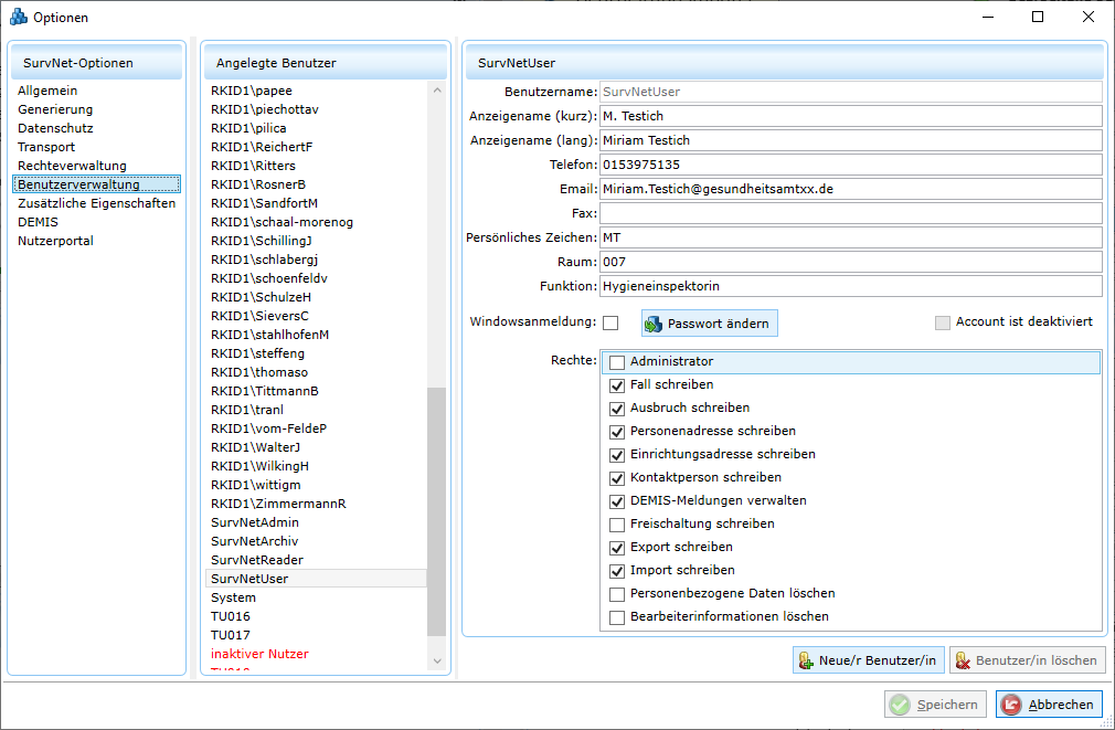 INFO Die vom System angelegten Nutzer SurvNetAdmin, SurvNetArchiv, SurvNetReader, SurvNetUser und System sind für die volle Funktionalität von SurvNet@RKI unbedingt erforderlich. Sie können weder deaktiviert noch gelöscht werden.
